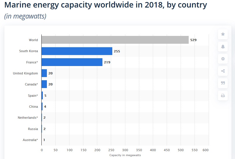 South Korea and France currently have around 90% of the installed ocean power capacity of the world