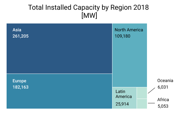 According to data from Wind Energy International, about 40% of all global installed capacity is located in Asia. With over 90% of that located specifically in China.