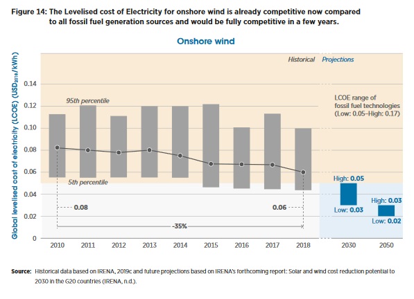 Due to high levels of investment over the last decade, wind power costs have dropped significantly. When it comes to onshore wind, IRENA predicts