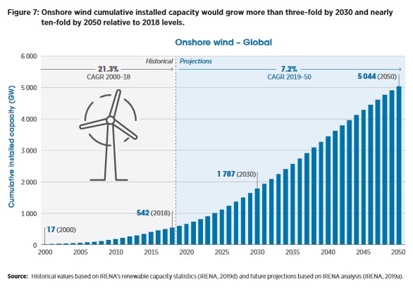 Projections from IRENA predict that by 2050, total installed capacity could grow