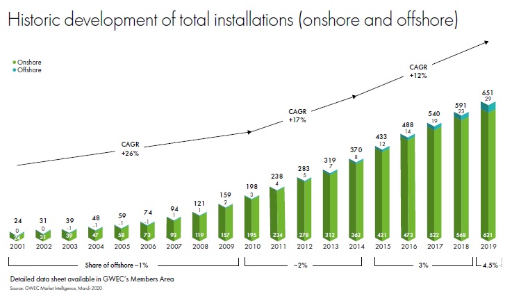 between 2001 and 2019, global installed wind capacity increased over 27-fold