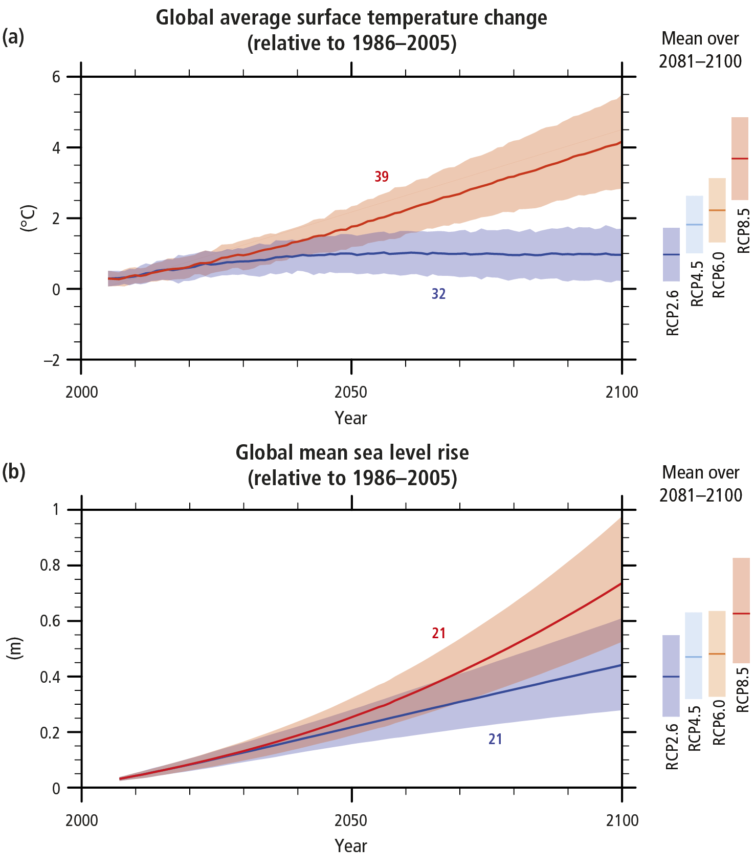 In the first, we can see that if we continue to burn fossil fuels at current rates, global surface temperatures could increase by about 4 degrees by 2100.