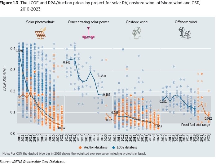 According to the International Renewable Energy Agency, costs associated with capture and conversion of wind and solar energy have dramatically