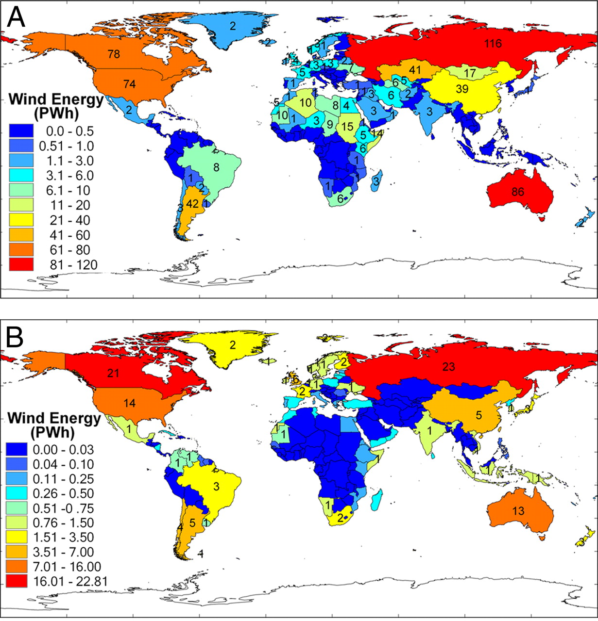 Annual wind energy potential country by country. (A) Onshore. (B) Offshore. National Academy of Sciences Jul 2009 [3] |