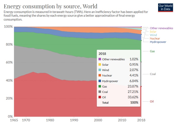 Currently 84.3% of worldwide energy consumption comes from fossil fuels (figures as of 2019)